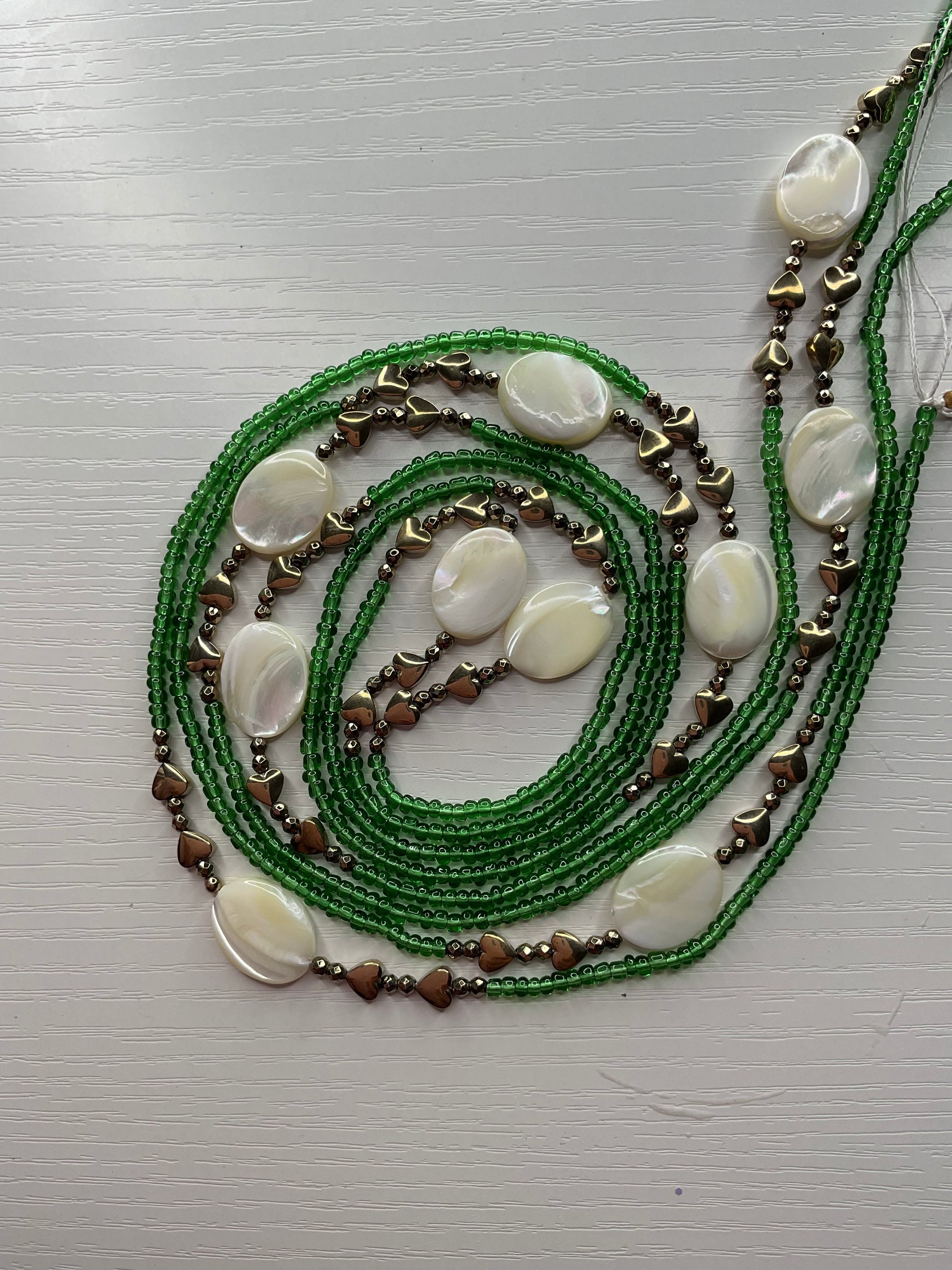 Grounded. Glowing. Divine. Our Golden Ivy Waistbeads capture the essence of natural beauty and feminine strength. Designed with radiant green seed beads, lustrous shell-like stones, and gold heart accents, this piece symbolizes growth, love, and abundance.